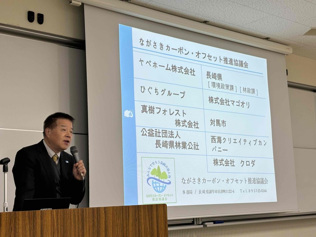 会員である真樹フォレスト株式会社の佐賀里氏が「日本の森林と林業経営」について講義を行い、長崎県林業公社の狩野氏が「J-クレジットによるカーボンオフセットの推進」について紹介しました。